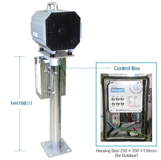 - Since it broadcasts with directivity and high power, it can transmit highly clear sounds to a long distant (1 ~ 3km).